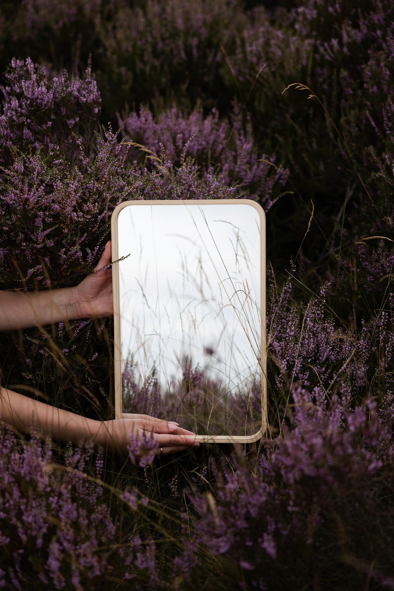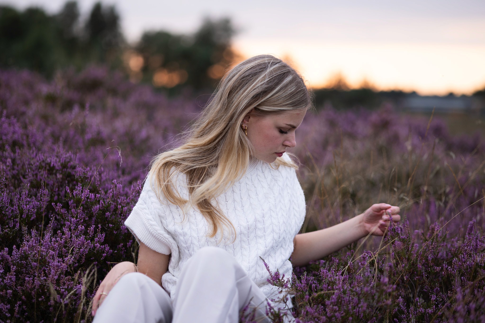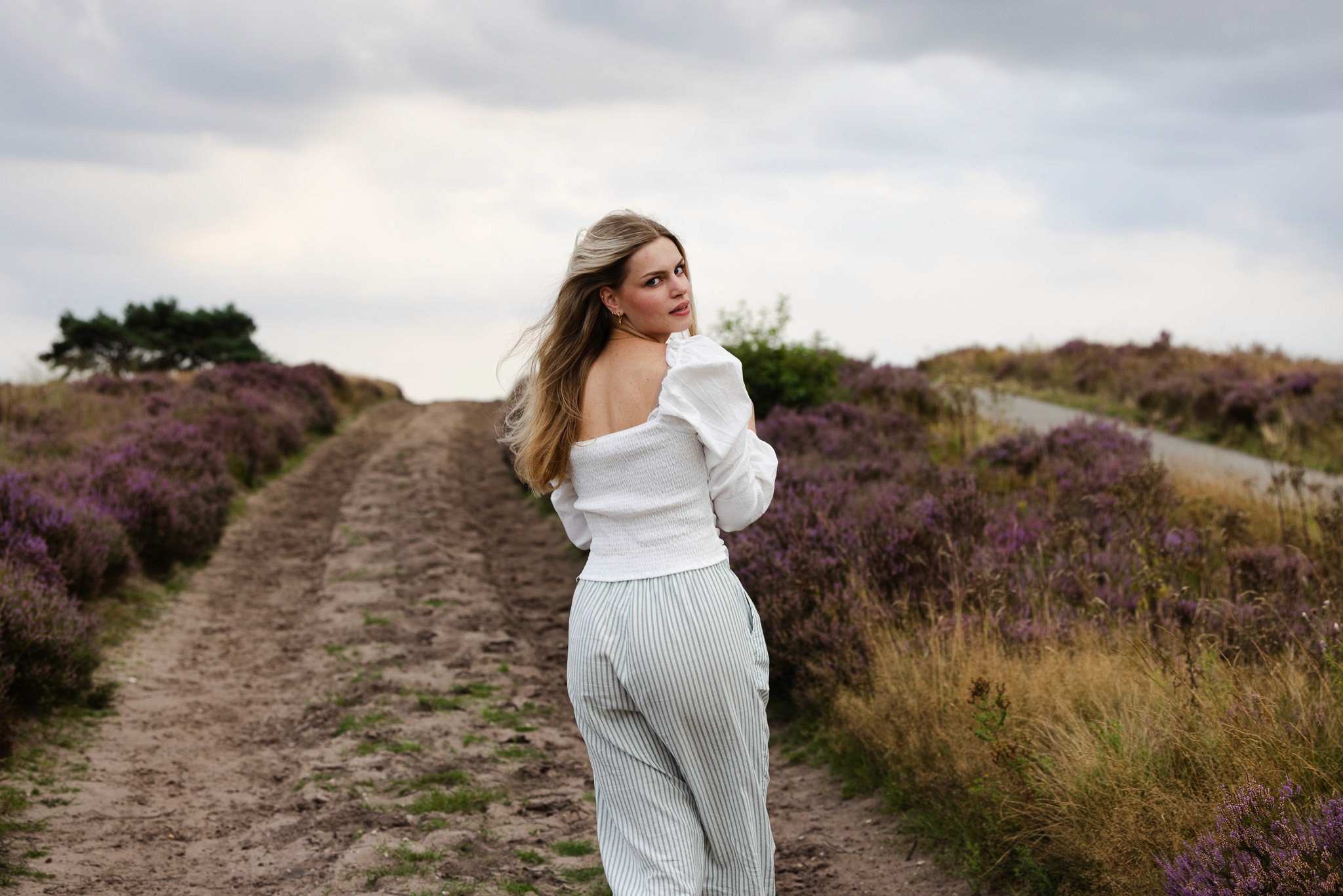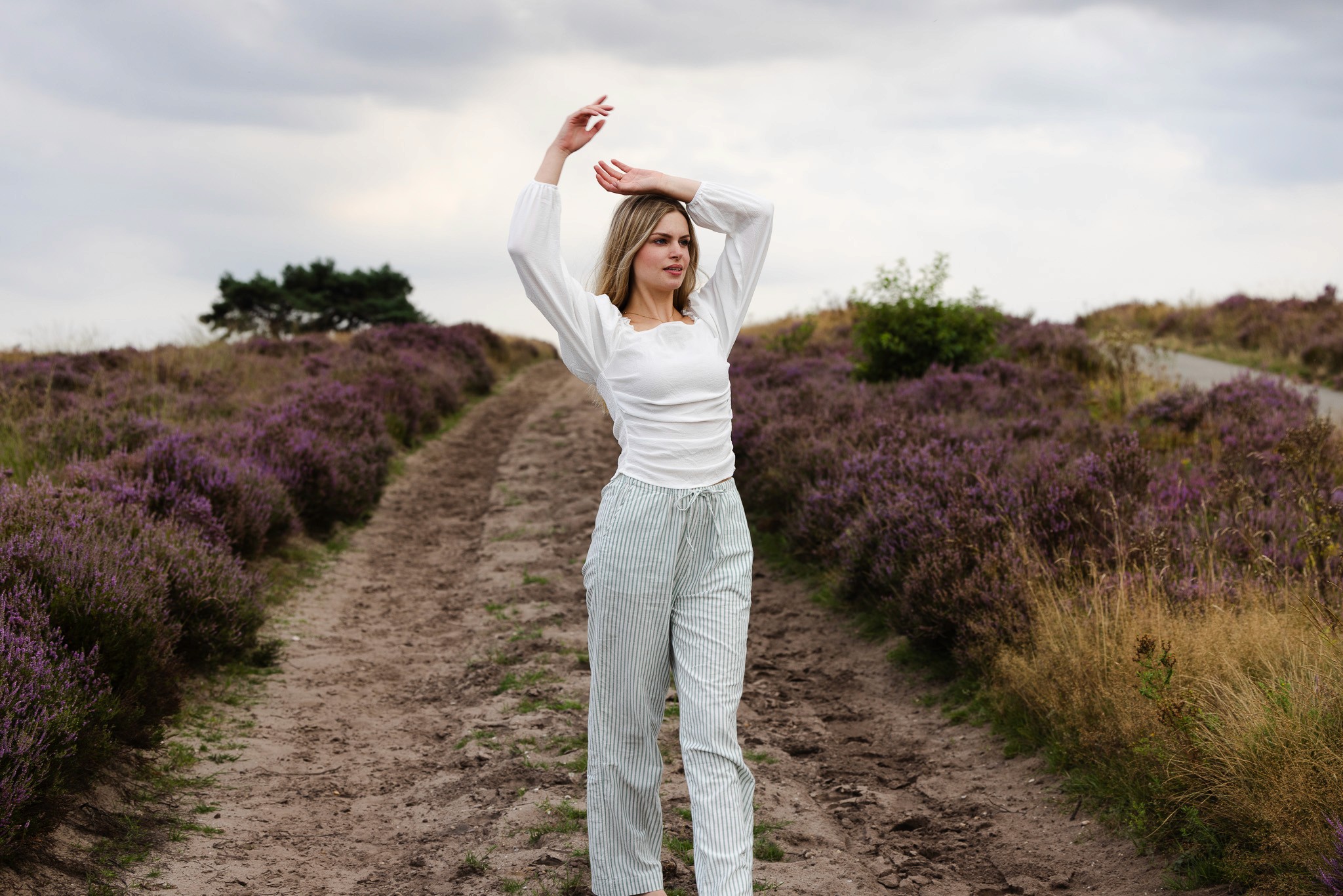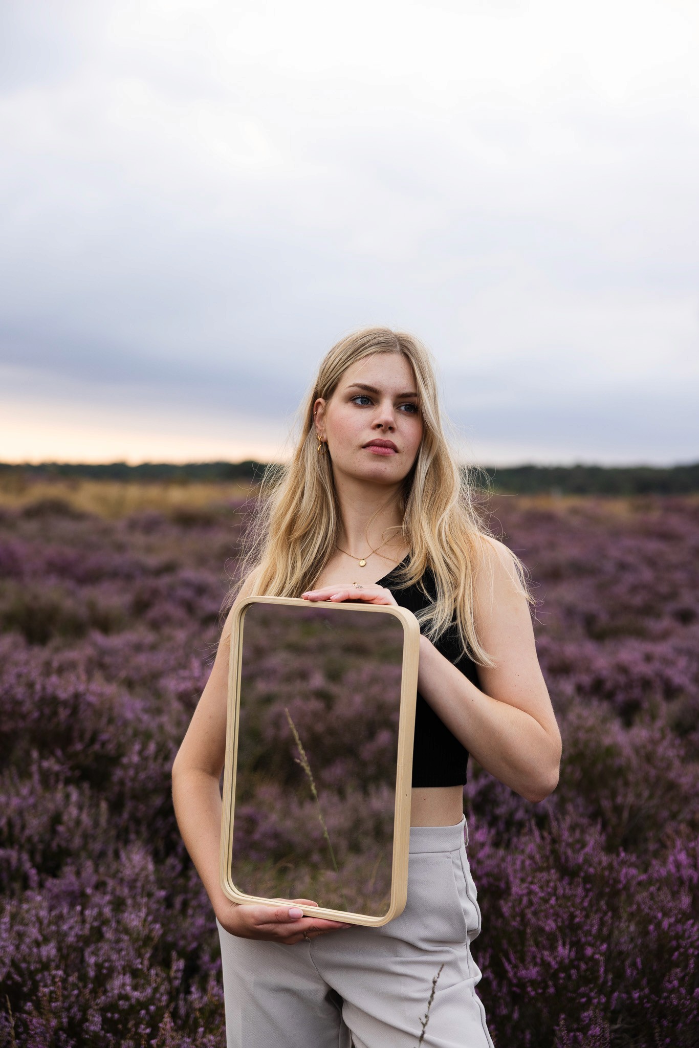 Amber voor de lens, in een setting die vroeg om iets kunstzinnigs. Tussen neutrale tinten en bloeiende heide ving ik haar in een spel van spiegeling en zelfreflectie. Romantiek en dromerige blikken lopen door elkaar heen, in beelden die je langer laten kijken, precies zoals bedoeld.